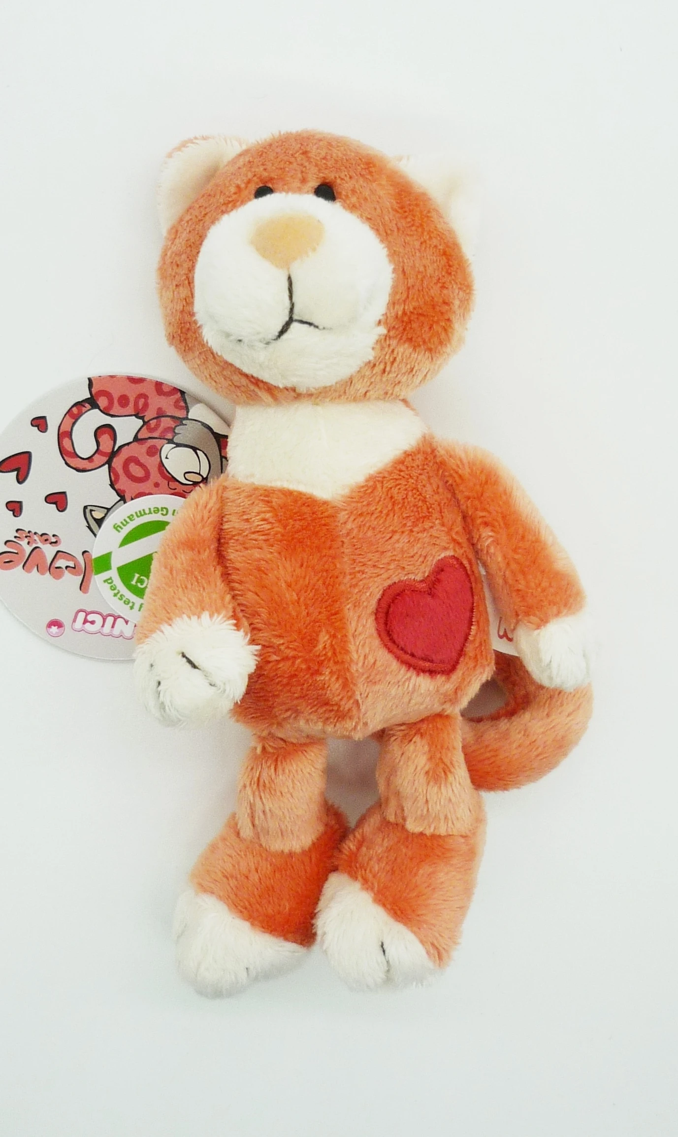 Mit Kunststoffaugen und aufgesticktem Herzen