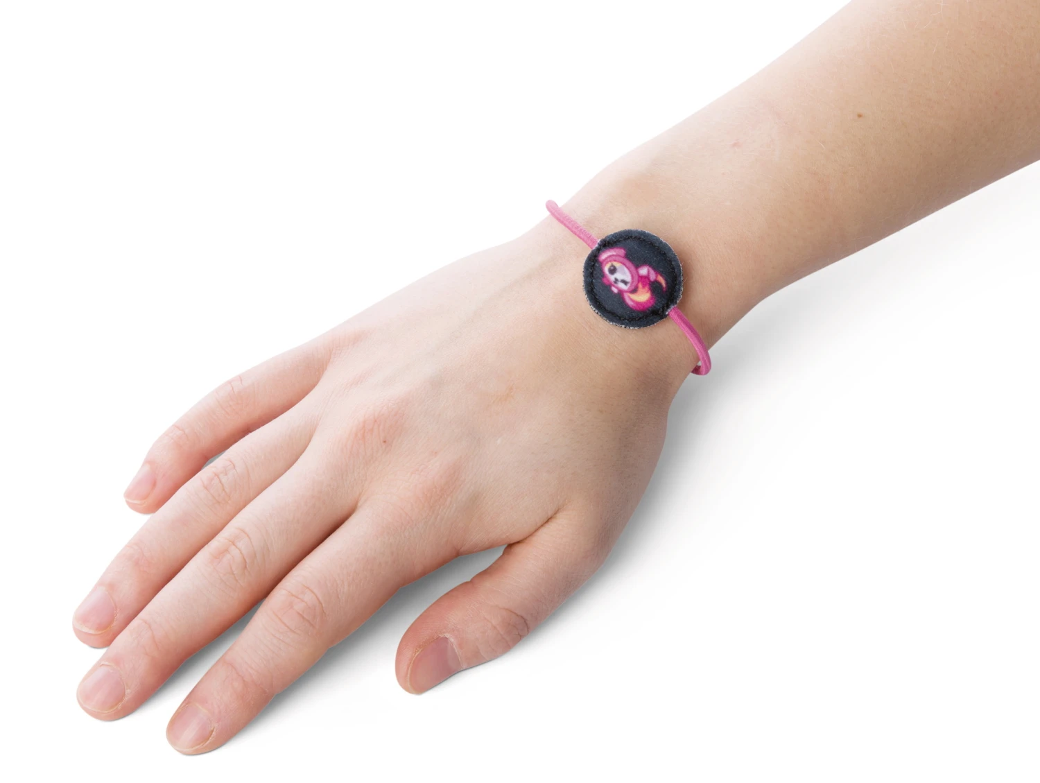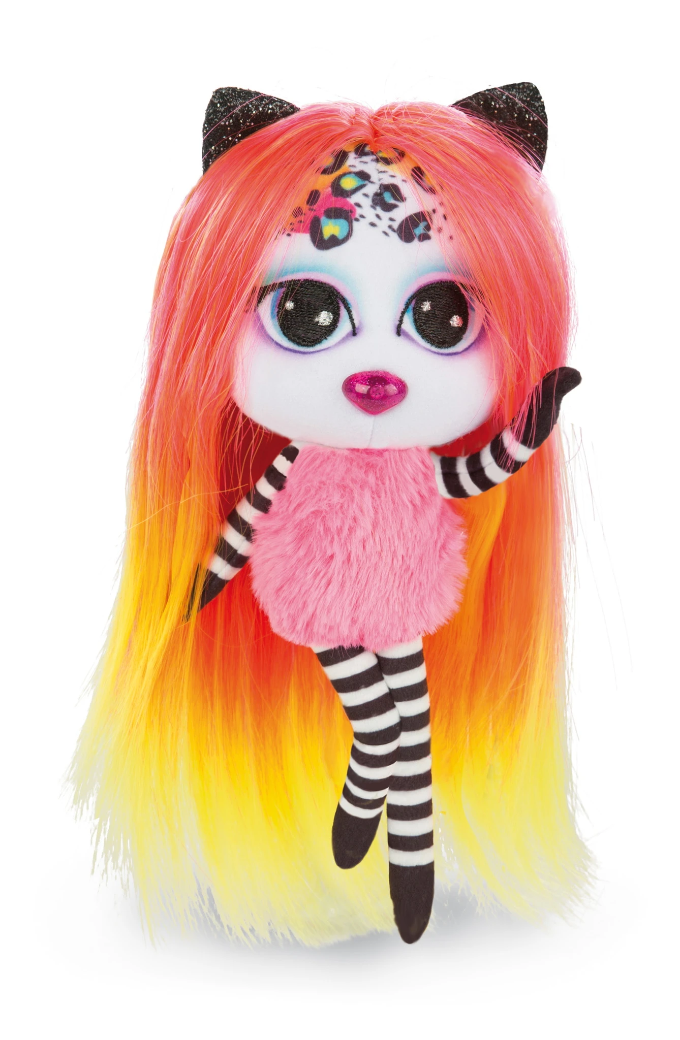 Zu der 20cm großen Puppe aus Plüsch mit den großen aufgestickten Augen, glitzernden Ohren und glitzernder Nase aus Kunststoff gibt es einen Kamm, passende Tattoos sowie ein Armbändchen.